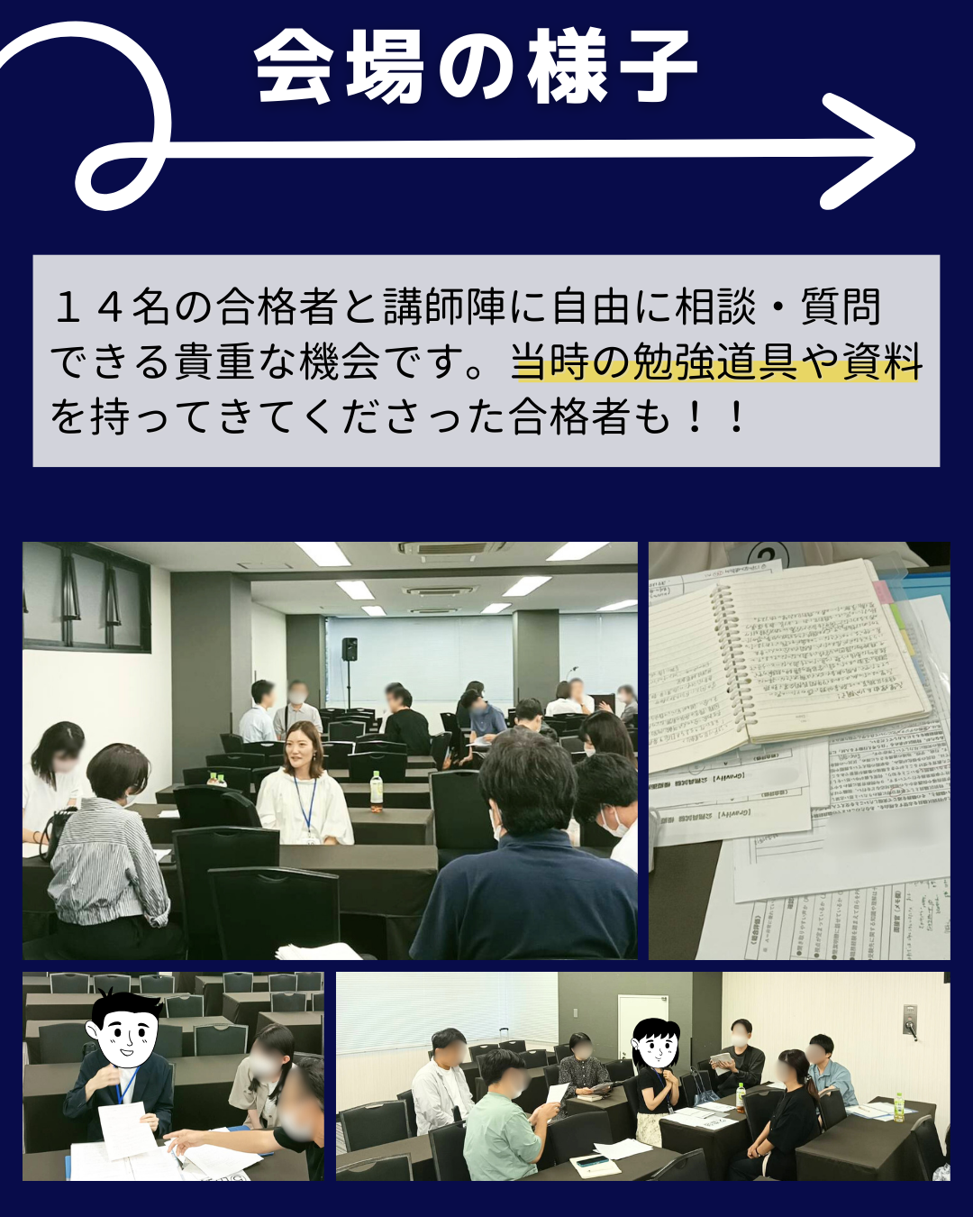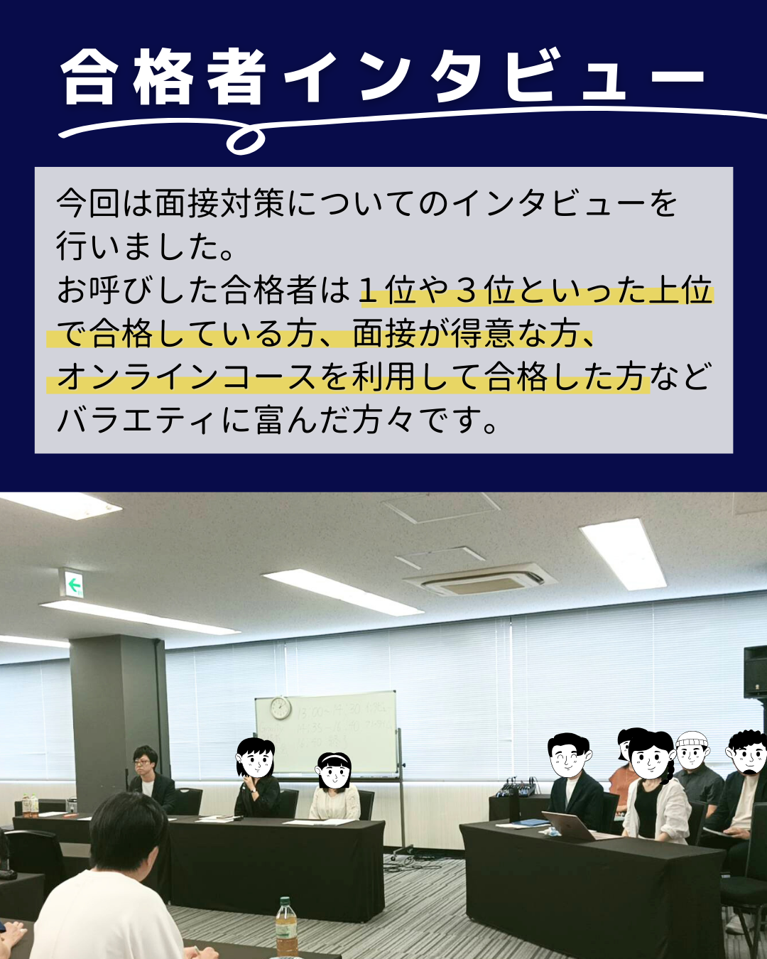 上位合格、公務員からの転職、地方からのオンライン利用で合格など、さまざまなバックグラウンドの方をお呼びしました。