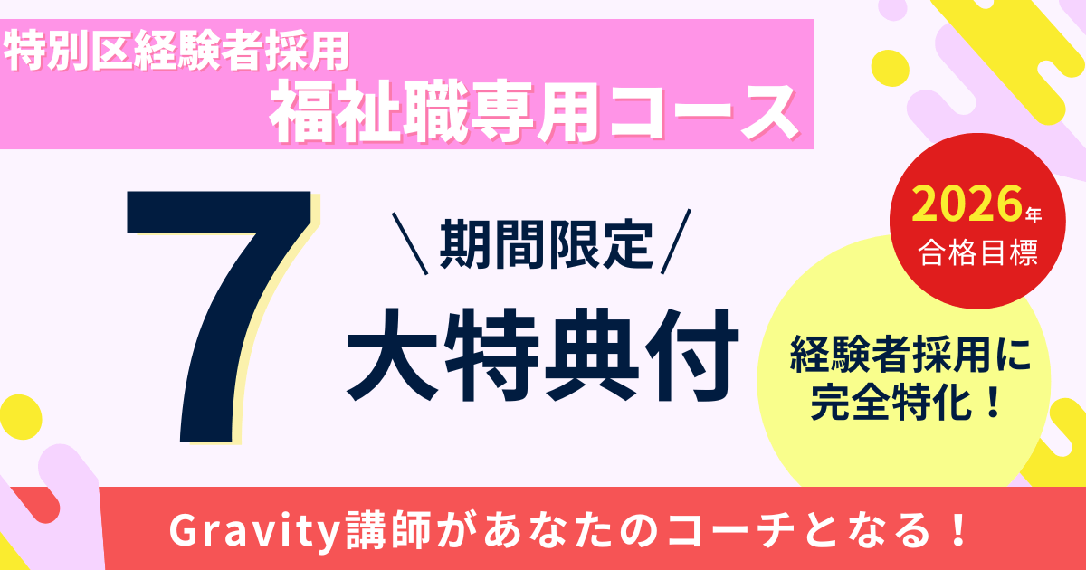 Gravityの特別区合格講座(福祉職専用コース)は、特別区経験者採用(福祉職)の最終合格に向けて、徹底して「論文対策」と「面接対策」を行う講座となります(福祉職の傾向と対策に完全特化)。